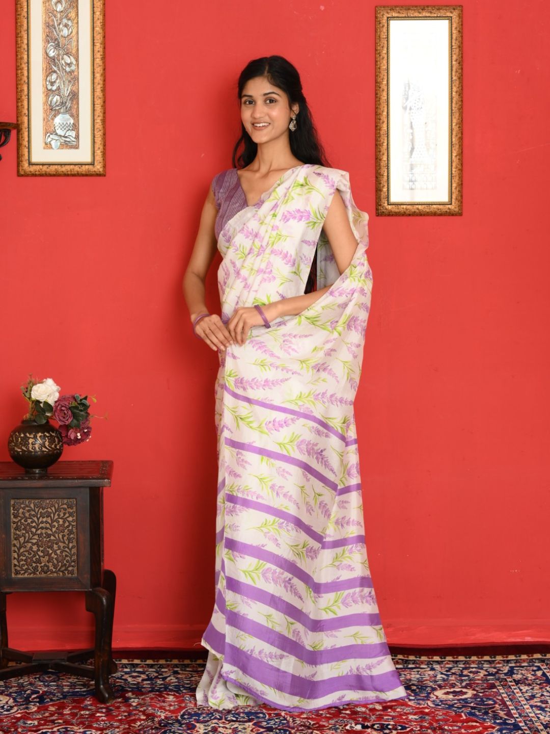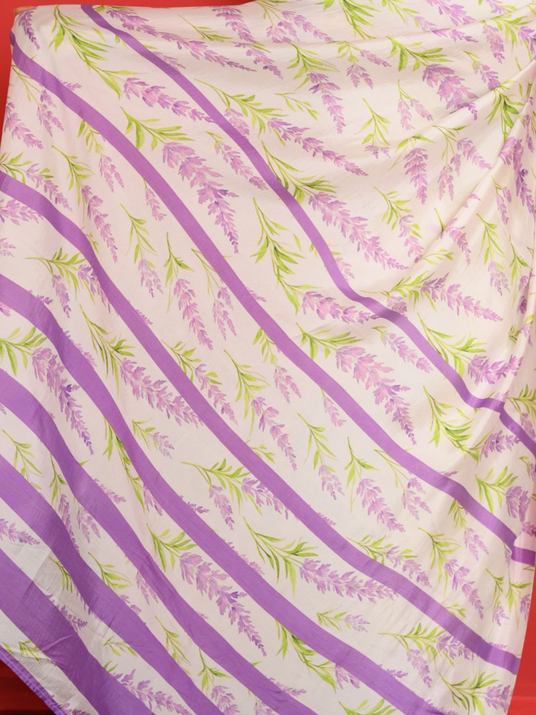 The saree features a white base with soothing lavender floral prints and matching lavender stripes throughout the body. The green leaf detailing adds a refreshing pop of colour, giving it a soft and feminine look.